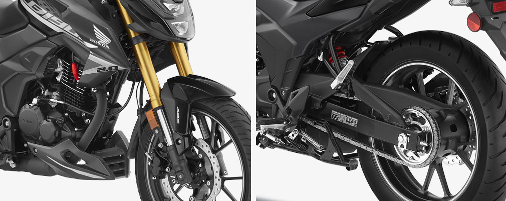 Equipada con suspensión Showa, la horquilla delantera invertida y el amortiguador trasero ofrecen un excelente equilibrio entre confort y control. Su puesta a punto permite absorber las irregularidades del asfalto con suavidad y mantener una respuesta firme en la conducción urbana.